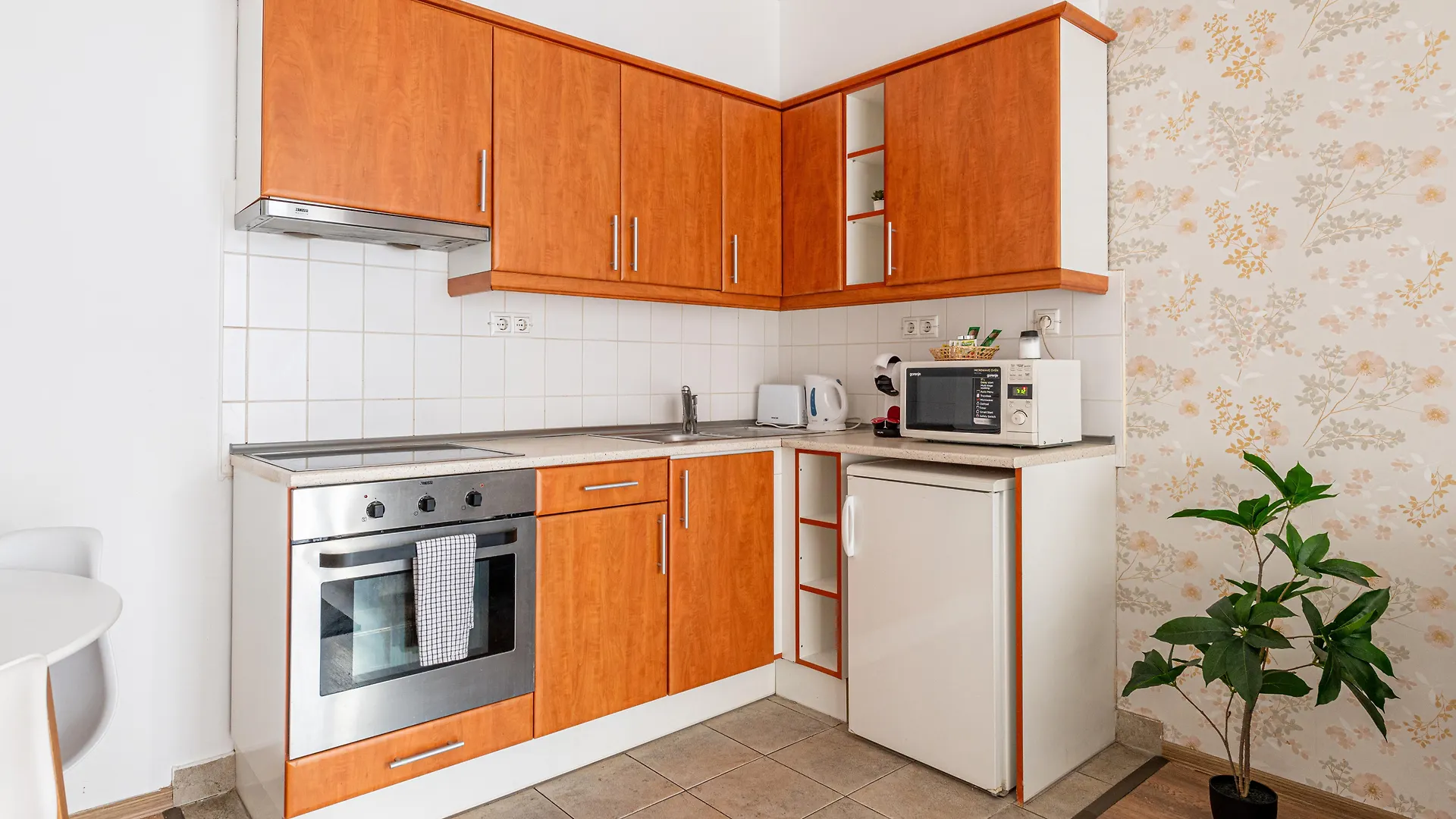 Het appartement is voorzien van een bank, koffie- en theevoorzieningen, een bureau, verder is er een ingerichte kitchenette met een magnetron, een waterkoker en een koelkast.